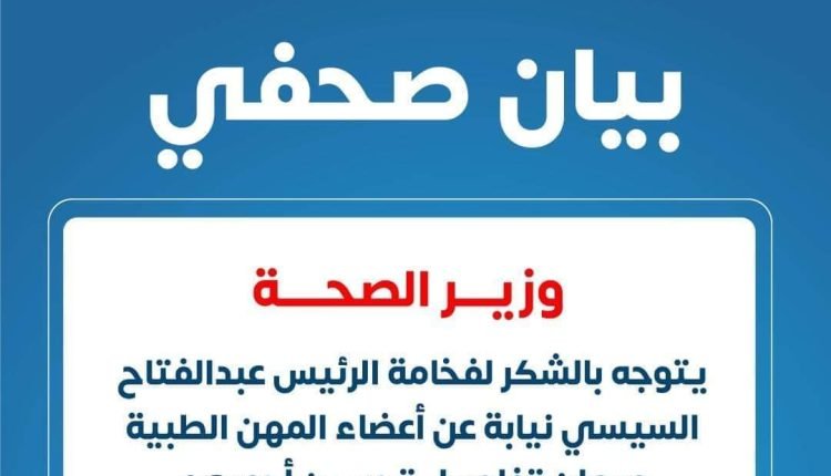 وفي ذات السياق، أكدت وزارة المالية أن الزيادات المذكورة تأتي بخلاف الزيادة في العلاوات الخاصة والدورية، والحوافز الإضافية، إلى جانب إقرار حافز المناطق النائية لباقي المخاطبين بقانون المهن الطبية، علاوة على تمويل المكلفين من أعضاء المهن الطبية. وزير الصحة يتقدم بخالص الشكر للرئيس “عبدالفتاح السيسي”